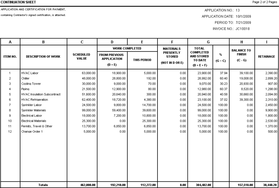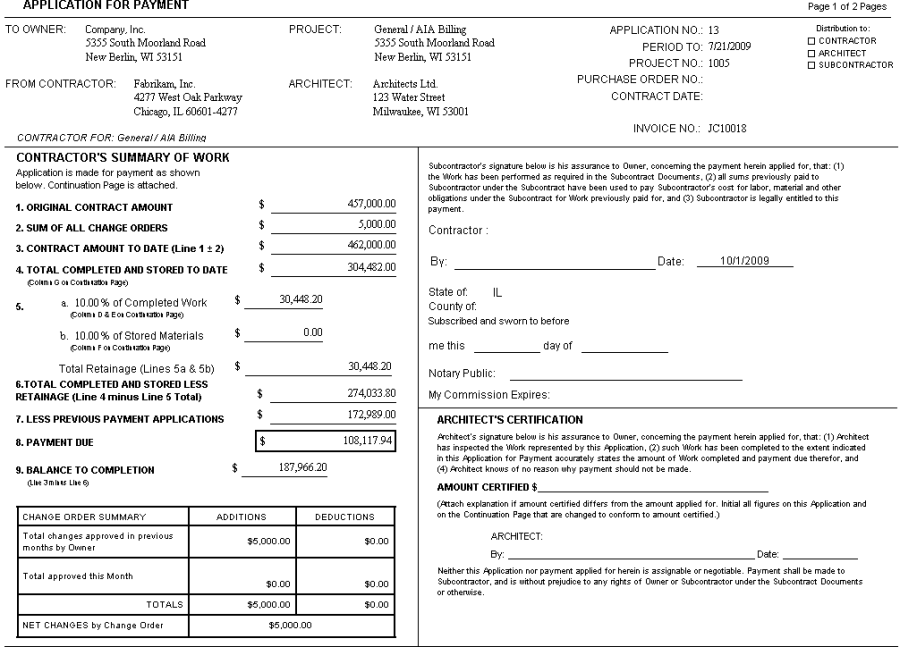 Contractors can use this report to apply for payment due, with architect certification, for jobs that use User Defined, Cost Code, and Project Bill Code billing types. To print on this AIA report, change order bill codes must be added through the Change Order window. Change order bill codes that were added through Job Maintenance, as well as unposted change orders or change orders that were posted after the printed date of the invoice, do not appear on this report. This report can be printed at the job or project level for invoices that are open or that have already been posted, either individually or by batch, from the following windows: