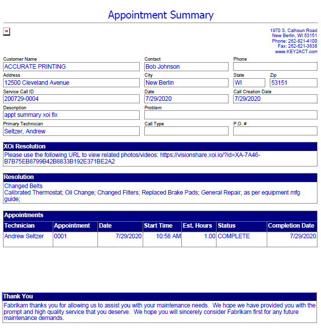This report is generated when a service appointment has been completed in MobileTech. This report displays the service call, appointment, labor, inventory information, XOi resolution hyperlink, resolution note, and technician/customer signatures related to the completed appointment.