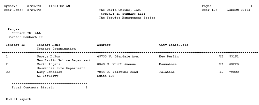 You can assign contacts to locations and maintenance contracts. The Contact ID report lists the contact ID, contact name, address, and contact organization.