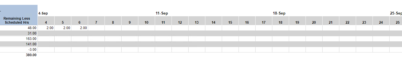 The Schedule displays to the right with a row that includes the scheduled hours for each cost code for the job. The screenshot below does not show the entire 6-weeks. The starting date correlates with the Schedule Start Date entered in the report parameters.