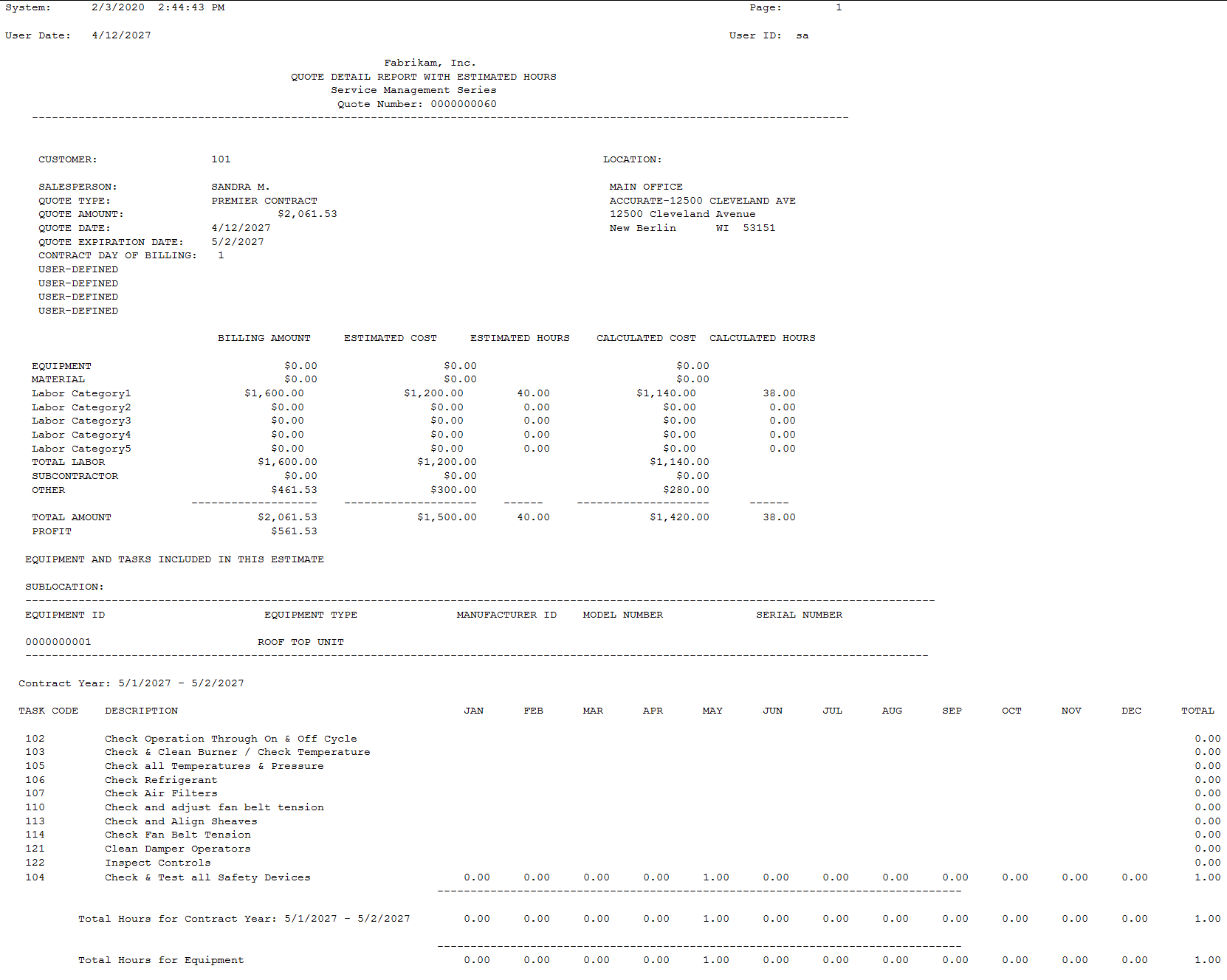 Lists information from the Contract Quote window, including billing amounts, estimated costs and hours, and task-based costs and hours. It also lists the equipment and tasks attached to the quote, as well as the estimated hours for the tasks.