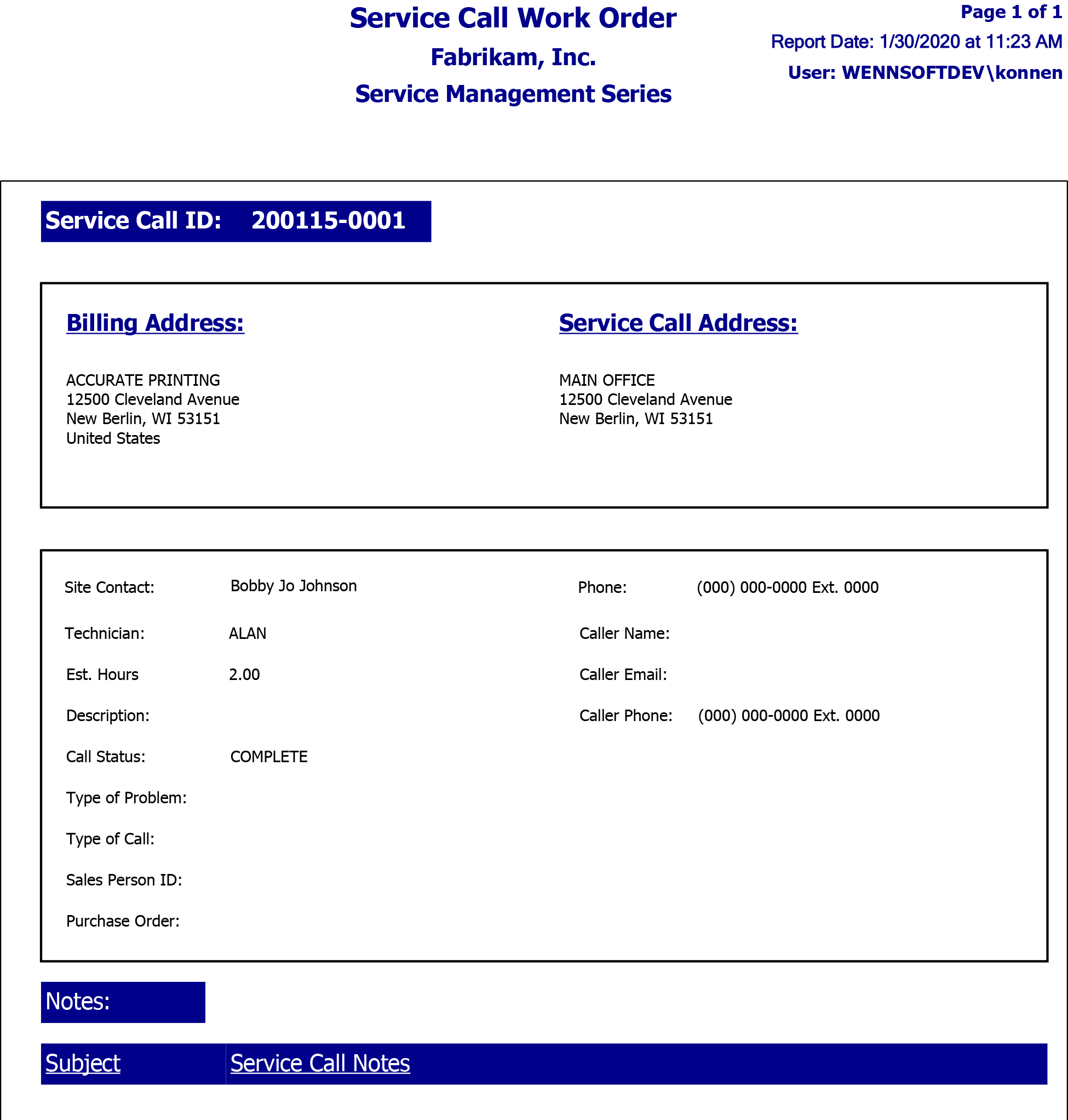 Workorder 1 breaks down key service call information. Technicians can quickly see the date and time a service call was received. This report lists the service call ID and invoice number along with brief service call details and the customer's address. The contact name, email address, and telephone number also included.