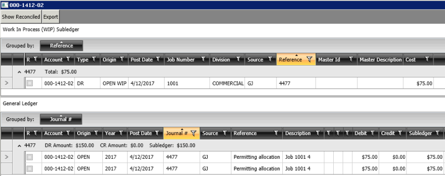 If you expand those groups, you can identify that one of the $75.00 transactions from this journal entry hit the General Ledger but did not hit your WIP subledger.