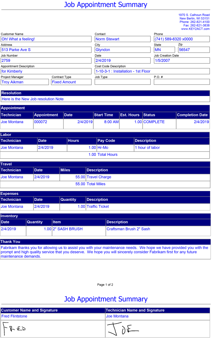 The Job Appointment Summary Report is generated when a job appointment has been completed in MobileTech. This report displays the job, appointment, labor, inventory information, resolution note, and technician/customer signatures related to the completed appointment. This report is attached to the Job Cost Code and is automatically sent by email to the recipients who are designated in the MobileTech setup.