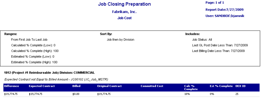 This report shows which jobs may be ready for closing based on either percentage complete or a lack of GL postings over time. This helps you identify unposted costs and any other items that may need to be taken care of before a job can be closed. You specify the jobs that appear as ready for closing based on the date of the last GL post, the last billing date, the estimated percentage complete, and/or the actual percentage complete. You can also filter the report by Job Status and/or Job Number and sort the report by job then division, or division then job.