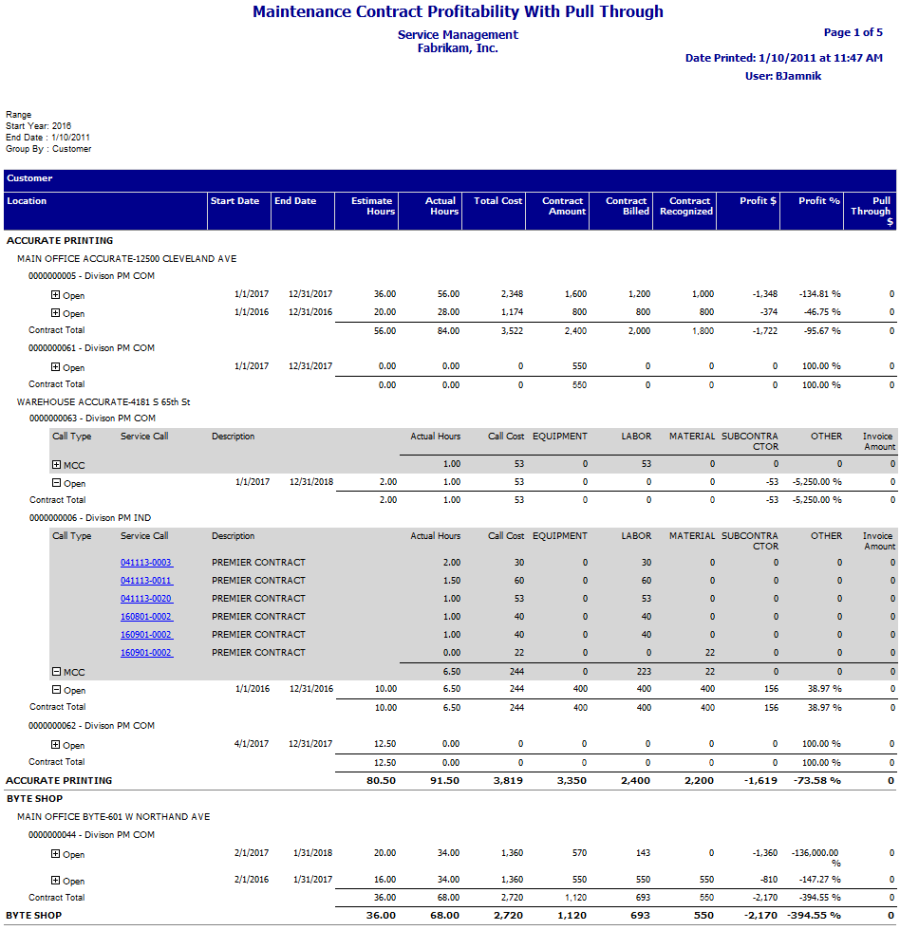 You can use this report to analyze the profitability of a maintenance contract based on costs and revenue amounts per cost category. This report also includes revenue and costs for any billable calls that are assigned to a contract. These amounts display as "pull through." Maintenance contracts can be grouped by customer, bill to customer, salesperson, master contract, or technician team. You can select a Start Year and contract End Date to view the contracts in that range, or select a Contract Number to view. For each contract, open and historical profitability information is summarized by date; previous versions of renewed contracts display, allowing you to compare profitability over time. Selecting the expand button allows you to Open contract detail by call type, with contract totals at the bottom. You can then expand a call type to view service call detail, with call type totals at the bottom. Zooming on a service call opens the Service Call Cost Audit report.