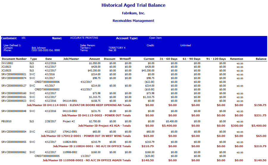 This report shows a breakdown of customer balances on a previous date, including transaction amounts, retention withholding, retention billing, and aging. Similar to Receivables Aged Trial Balance, which reports the most recent aging and amounts that are currently outstanding, the Receivables Historical Aged Trial Balance report allows you to review past transactions, previous balances, and payment history. You can group information by job/master ID, or you can view transactions by customer, totaling all jobs/master IDs assigned to that customer. You can also view report totals for all customers. You can select to include information from Service Management, Job Cost, and/or Equipment Management. A job/master ID can be a Job Cost job or project invoice, a Service Management maintenance contract, master contract, or service call invoice, or an Equipment Management rental invoice. You can also specify whether you want to show credit balance and zero balance information, no activity, fully paid documents, and unposted applied credit documents. In addition to using this report to help with collections, the transaction detail on the Receivables Historical Aged Trial Balance report supports the balance in your Accounts Receivable and Retention Receivable GL accounts. You can print this report from its location in the Report Manager, or from Microsoft Dynamics GP by opening the Administration page and locating this report on the Custom Report List.