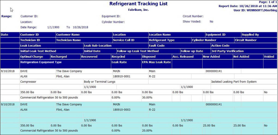 If you are using Refrigerant Tracking, you can print a report that displays all refrigerant tracking records. This report can only be printed from Report Manager. Also included in this report are the new Section 908 EPA fields required for leak rate tracking including the refrigeration equipment type, maximum allowed leak rate, and the actual leak rate. The refrigerant tracking records on this report can be filtered by Customer, Location, Equipment ID, Cylinder Number, or Circuit Number. You can also select to display voided records, and filter the list of records by date. The report has a conditional box added to the bottom of the report to print when the equipment is a component of another piece of equipment. The message that displays is "This is a component of Master Equipment ID (xxxxxxxxxx) Description: xxxxxxxxxxxxxxxxxxxxxxxxxxxxxxxx". If the equipment is not a component, the box with comments does not display.