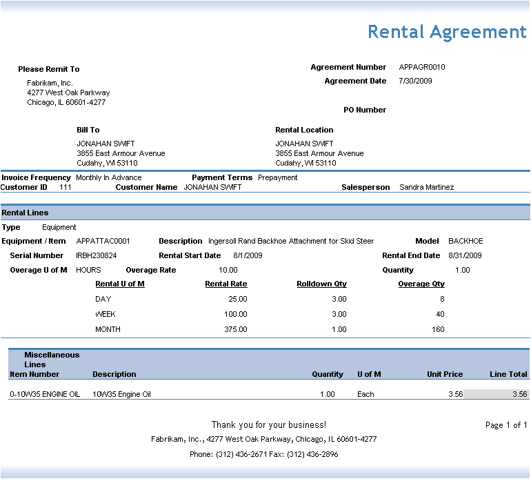 This report is used to detail a rental agreement, including miscellaneous rental lines and any standdown information from the Rental Agreement Standdown Lines subreport. By default, billed information is included on the report; you may select to include billed information if you are printing this report for internal use or to send to a customer to confirm rental rates and totals, or you may elect to hide billed information if you are printing this report as a contract to send to a customer.