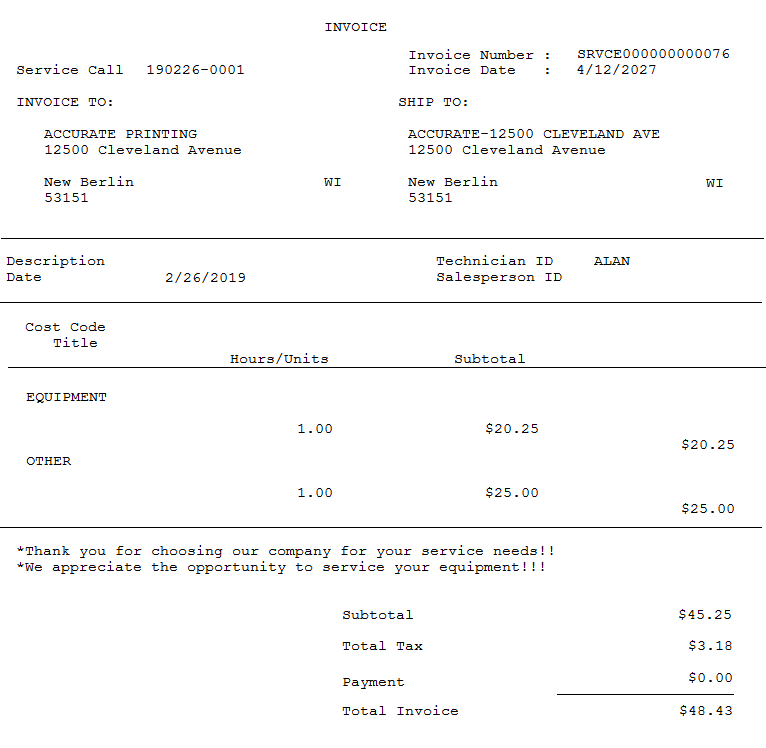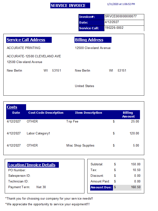 This customer-facing report is used to detail an invoice or credit memo for a service call, including a cost breakdown and detail of charges.