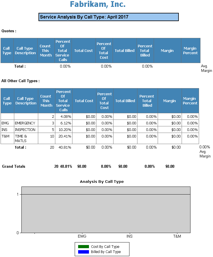 Shows revenue, total cost, number of service calls, and amounts billed for each service call type. Also shows these as percentages for each type compared to the total number of calls that month. This allows you to keep track of margin amount and margin percent.