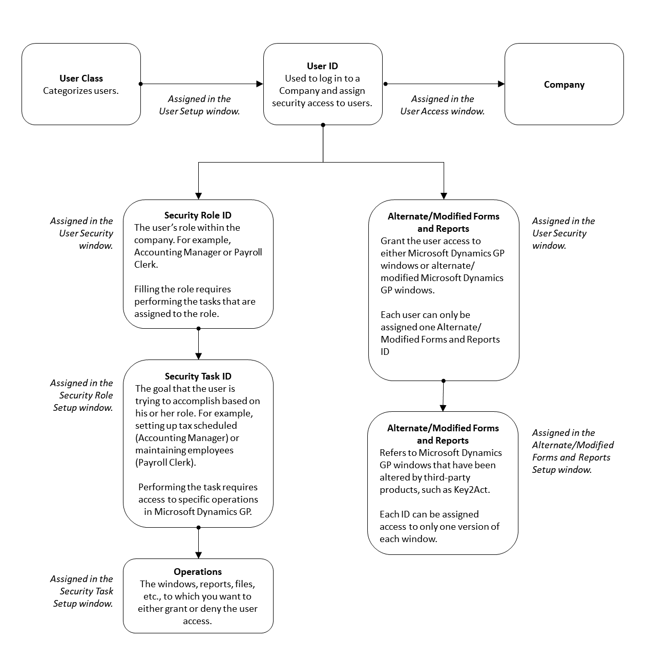 Before you begin to set up security, take a few minutes to organize how each person will be using Signature. Which windows and settings will each user need to access? What windows and settings should each user not be able to access? You should have set up User Classes, User IDs, and user access to companies in Microsoft Dynamics GP setup. For more information, refer to these topics in the Microsoft Dynamics GP user manual. Each Signature user must be assigned additional roles, as well as access to alternate/modified forms and reports, before using Signature. You must set up tasks, roles, and Forms and Reports IDs before users can access Signature operations.