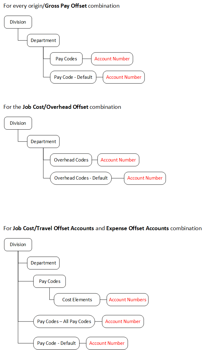 Each level contains a Default and All branch. Default is used when you want to assign a default account for that department, pay code, and so on, one is not needed at a lower level, such as per pay code, overhead code, or cost element. All is used when you know that there will be no specific accounts, and one account will suffice. Even the lowest levels within a hierarchy (Pay Code, Overhead Code, or Cost Element) have Default and All.