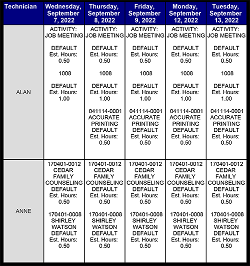 | SMS-1581 | Users can now view and/or print the new Schedule Technician Board report that displays in table format and is available from the Report Server only. Schedule is required to view this report. The table displays the technician's name, day/date, and any relevant appointment information including service appointment ID, job ID, and/or activity, customer ID, and estimated hours. Report options include: