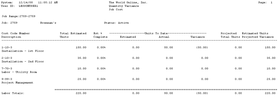 The Quantity Variance report compares the estimated unit to date for each cost element with the actual units to date used. The report shows an estimated project variance for each cost code. Total projected variance amounts calculate automatically for all cost elements.