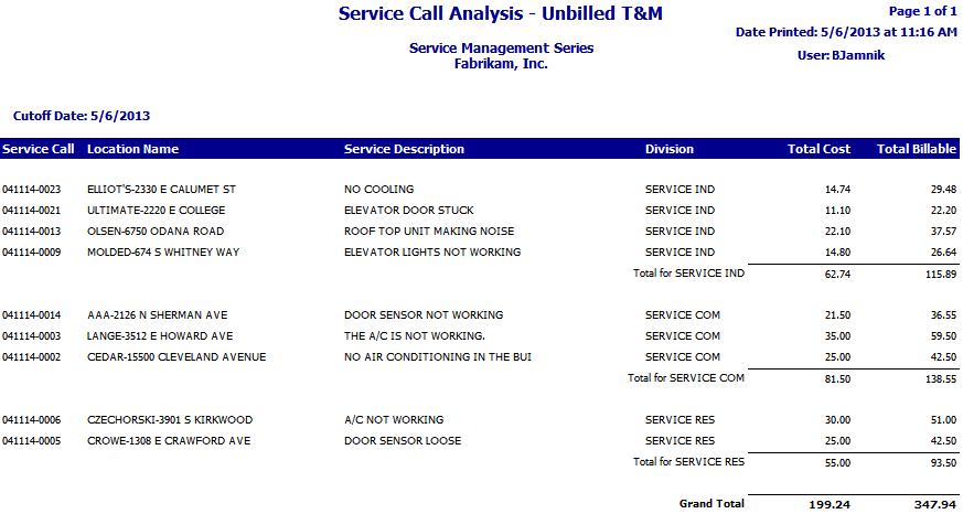 This report allows you to view unbilled T&M service calls, and the amounts that are yet to be billed. Enter a cutoff date to view unbilled T&M service calls up to that date, listed by division. You can view the total cost and total billable amount for each service call, as well as division subtotals and report totals.