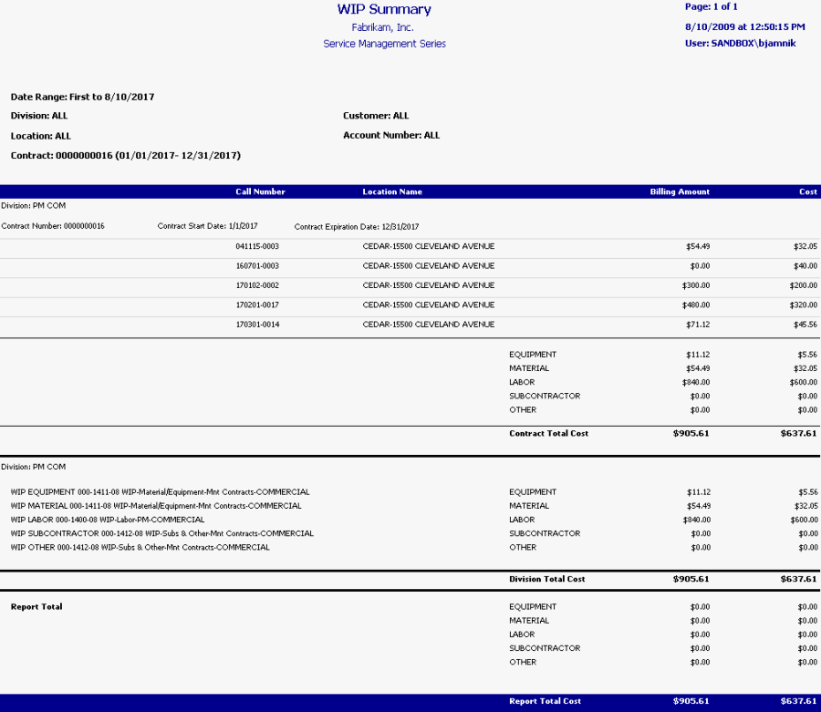 This report prints service WIP account totals, allowing you to view unbilled service work and open maintenance calls. Service call billing amounts and costs are grouped by contract, then totaled by category for each contract. These contract totals are grouped by division, allowing you to review the service division account totals, as well as category totals for the entire report. The Service WIP report can be run as part of the month end closing process, to help ensure that your Service WIP accounts balance with the General Ledger WIP accounts. Refer to the user manual for more information on using WIP reports at month's end.