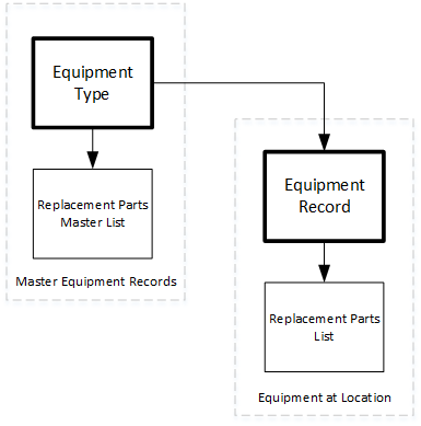 When creating an equipment record, you can zoom on the Equipment Type field to open the Equipment Type Setup window. The Replacement Parts button in the Equipment Type Setup window opens this master list of replacement parts. If you add new items to the replacement parts list in this window, you are adding them to the master list of replacement parts for the equipment type, not the equipment record.