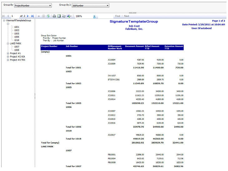 Example: You may decide to use this template to create a Job Invoice Report. Additional fields such as Document Amount and Billed Amount are added as columns when you edit the report template in Report Builder. In Report Manager, values are grouped first by Project Number, Customer Number, Customer Name, or Batch Number. Values are grouped next by Job Number or Job Name.