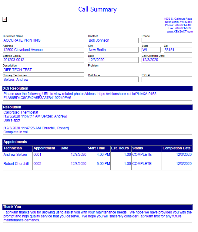 This report is generated when a service appointment has been completed in MobileTech. This report displays the service call, appointment(s), labor, inventory information, XOi resolution hyperlink, resolution note, and technician/customer signatures related to the completed appointment. This report is attached to the Cost Code and is automatically sent by email to the recipients who are designated in the MobileTech setup.
