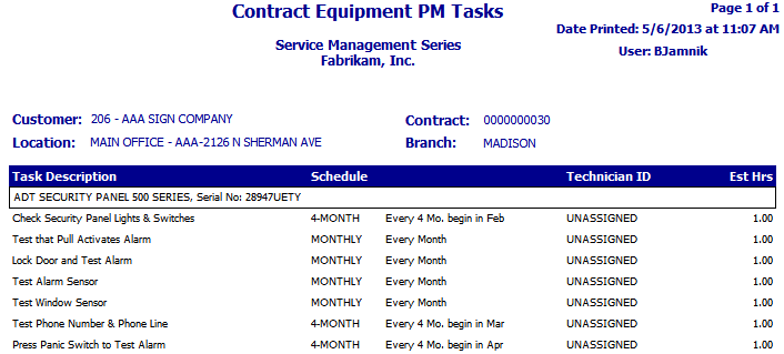 This report allows you to view preventative maintenance tasks for equipment on a contract. You can view the tasks, schedule, assigned technician, and estimated hours. Select the Customer, Location, and Contract to view preventative maintenance tasks for equipment.