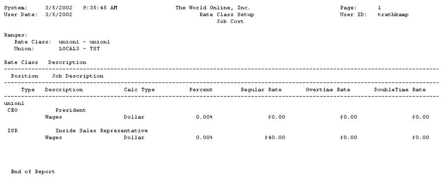 The Rate Class Union report is a combination of the Union report and Union Summary report. Both reports contain the amount of hours and gross wages. The Union report is organized by union employee; the Union Summary report is organized by union and rate class. You can run the report for a single union code or a range of union codes.
