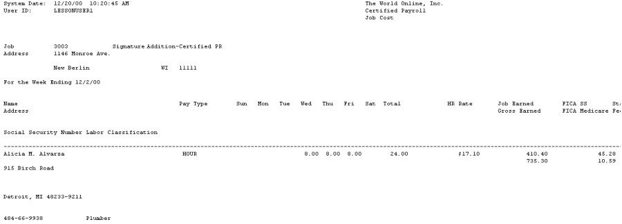 The Certified Payroll report lists employee information, details of hours worked, hourly rate, gross earned in job, deductions, and net weekly pay for the selected jobs.