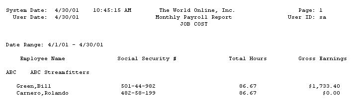 - Select Reports > Job Cost > Labor Reports > Monthly Payroll.
