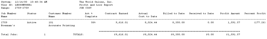 The Profit and Loss report contains the actual percentage complete, contract earned amount, actual cost to date, actual billed to date, and amounts received for the selected job range. The report also provides a snapshot of whether a job is operating at a profit or loss. When you print the report for a single period, the percent complete is based on costs incurred for that period only. This is also true for cost accumulated and amount earned. To view this information for a specific job, the selected range must include all periods since the job was opened. For example, you may complete 40% of your job in Period 1 and 60% in Period 2. If the report is restricted to Period 2, it will only show the 60% that was completed in that period. If you include both periods in the report, it will show the job as 100% complete.