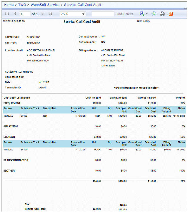 This report shows all the costs that have been associated with a service call. You can see the total amounts by cost category, or expand the category to view all the transactions associated with that cost. The invoiced status also appears next to each transaction to provide you with information about which costs have been billed.