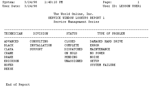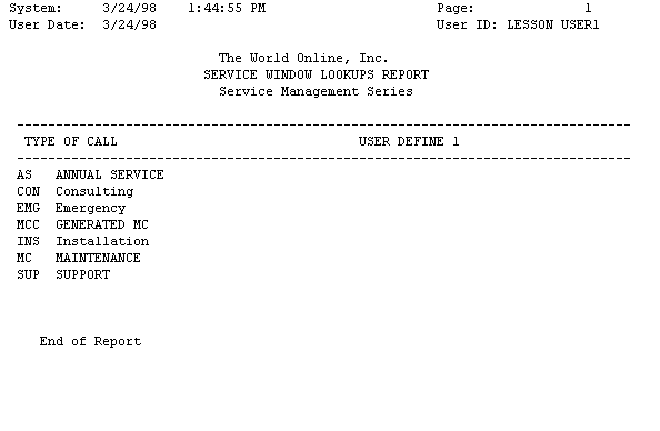 There are two Service Call Window Lookups reports. The first report lists the contents of the Technician, Division, Status, and Type of Problem lookup windows. When this window is closed, the second Service Call Window Lookups report opens, listing the contents of the Type of Call and User-Defined 1 lookup windows. Select Reports > Service Management > General > Lookups > Service Call.