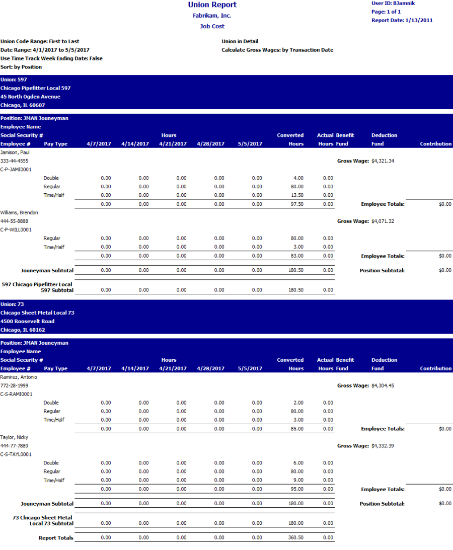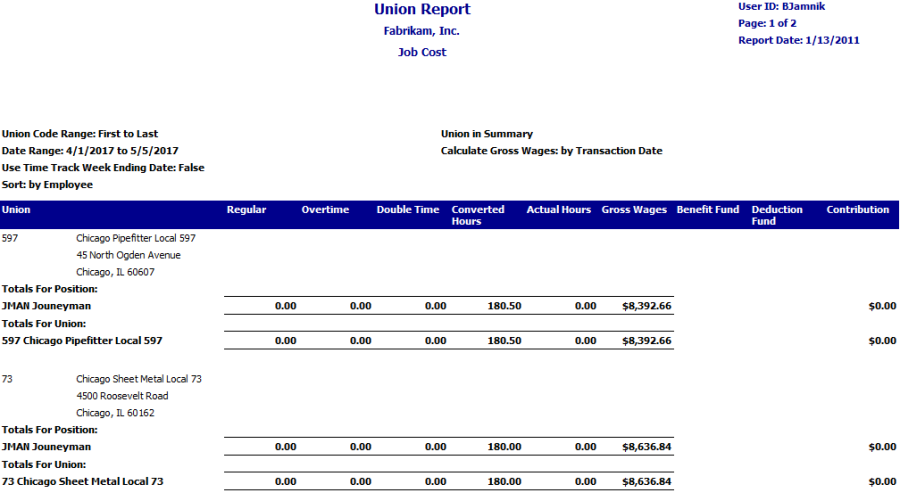 This report allows you to view union payroll information such as benefit and deduction contributions and weekly pay amounts. Depending on your sort option, you can view union payroll details by employee, or by employee and position, as well as report totals for all union employees. The detailed version of this report prints by default, but you can select the summary view if you wish to view only position and union totals, without employee detail. For each week, hourly totals display per the employee's pay type: Actual Hours is a summary of all hours, regardless of pay type, while Converted Hours are calculated based on pay type. For example, 6 hours of double time converts to 6 actual hours, but 12 converted hours. If you have reports set up to print from GP, print this report by choosing Reports > Job Cost > Labor Reports > Union, or, if you are using rate classes, Reports > Job Cost > Labor Reports > Rate Class Union.