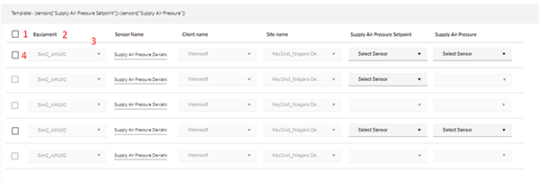 The Assign tab accessed when creating a custom calculated sensor has a few cosmetic changes such as removing the "select all" checkbox's label, adding a horizontal line, moving the headers to be level with the checkbox, and horizontally aligning the fields in each row. Functionally, nothing has changed. See Assigning Templates to Equipment. K2AINT-4226