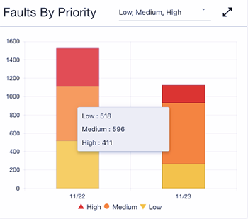 On the Executive Summary dashboard's Faults by Priority tile, we've added a tooltip that displays the low, medium, and high fault numbers that correspond with the bar graph that you are hovering over. K2AINT-3855