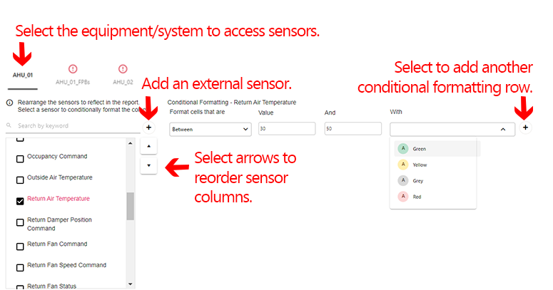 The Optimization Report now provides the ability by equipment/system to add an external sensor, apply conditional formatting to the sensor data, and arrange the column order of sensors to display on the report. See Optimization Report. K2AINT-4072