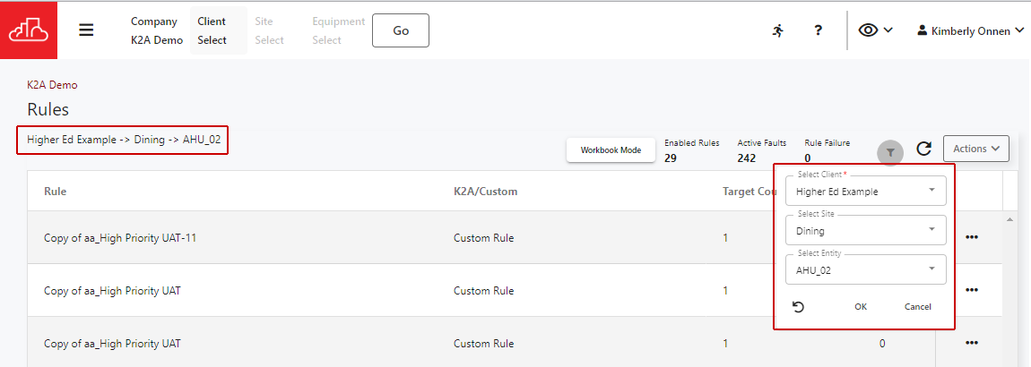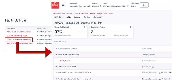 On the Executive Dashboard, when filtering to a specific site, the Faults by Rule tile now displays the rule names as hyperlinks. When selected, a new browser tab is opened and displays the Site Dashboard in the Faults View. K2AINT-4596