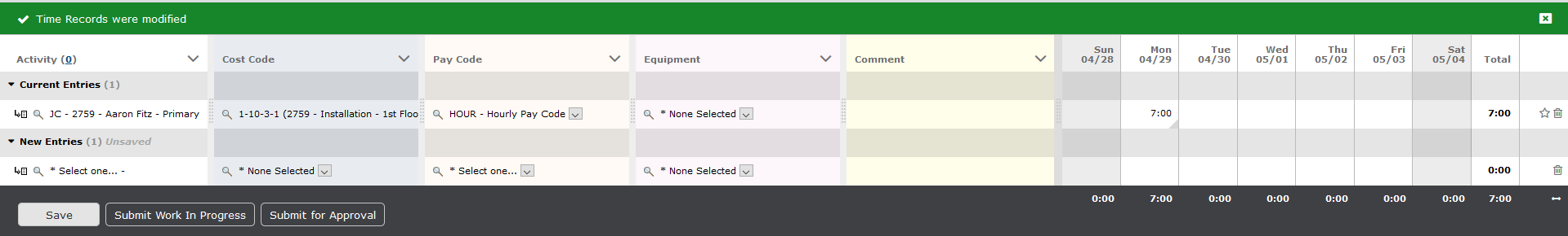 A user with a timesheet that allows interim submission, which includes the Submit Work In Progress button next to the Save button, looks like this: