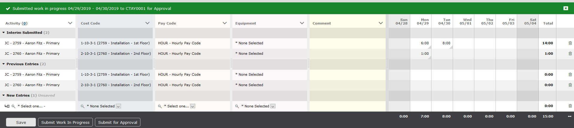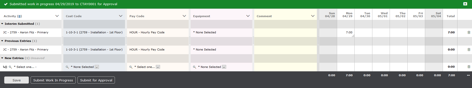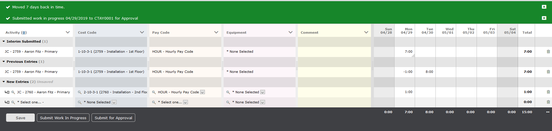 Note that the time logged on Monday is displayed in a new section labeled Interim Submitted. While the interim submitted and approved records cannot be edited directly on the row in which they appear on the timesheet, a copy of the entry is automatically added to the Previous Entries section so that the user can continue to log time for the same job for the rest of the period.