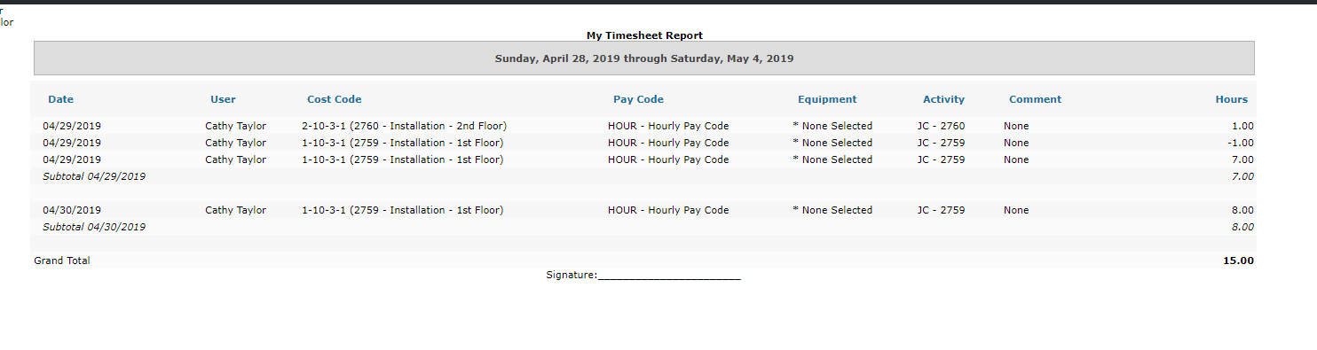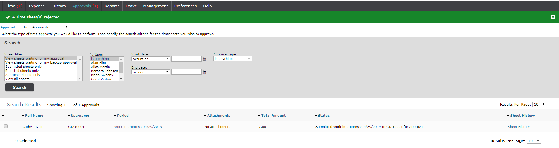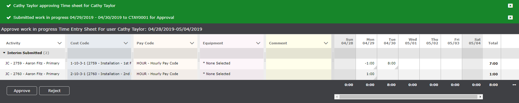 This is an example of what her supervisor sees in the approval queue after the user (Cathy Taylor) has submitted her work in progress for Monday compared to full sheet submissions already in the queue: