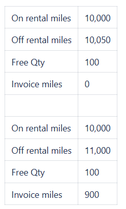 If the equipment you are renting does not involve mileage charges, you may want to provide an overage amount to consider the mileage incurred when transporting the equipment. Enter the amount of free mileage in Total Overage Qty. The off rental invoice will compare the on and off rental miles with the free quantity and charge accordingly. In the first example, the free overage covers all the off rental miles, so there are no miles to invoice. The second example shows that there are still 900 miles that will be invoiced at the overage rate, after the free quantity has been subtracted.
