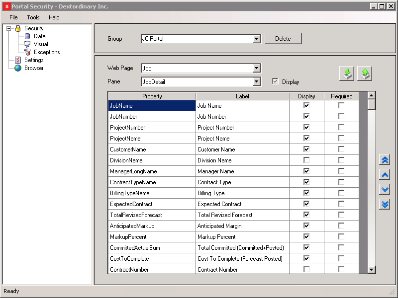 Security > Visual | Determine which properties display on the portal pages for each security group. |