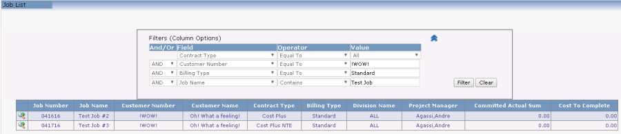 In the following illustration, only fixed contract and standard billing jobs are displayed for a specific customer who has jobs with a cost complete amount that is greater than $200.