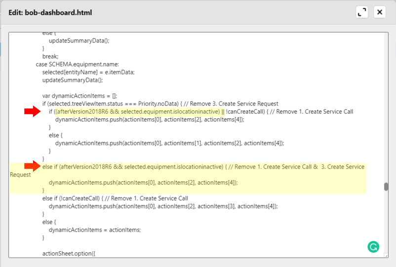 if ((afterVersion2018R6 && selected.equipment.islocationinactive) || !canCreateCall) { // Remove 1. Create Service CallIn the same section, you will also need to remove the following lines:else if (afterVersion2018R6 && selected.equipment.islocationinactive) { // Remove 1. Create Service Call & 3. Create Service Request