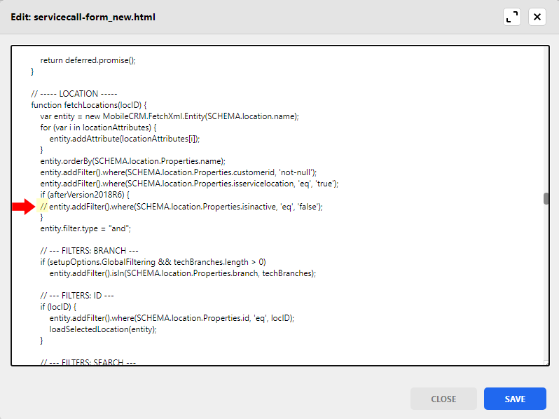 if ((afterVersion2018R6 && location.properties.isinactive) || (!canCreateCall && selected.equipment.statusNo === undefined)) {Remove ((afterVersion2018R6 && location.properties.isinactive) || as well as the second right parenthesis " ) " from the line so that the line displays as: