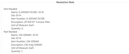 Screenshot of the pop-up form after the technician has selected the item from the Site Inventory List: ![]() Screenshot of the Resolution Note Snippets window in Signature: ![]() Screenshot of what the note looks like on the Appointment form in the Resolution Note section with 2 different parts needed: ![]() |