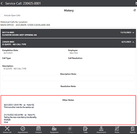 MT-875 | An IncludeAllCallNotesWithHistory setup option has been added to the MobileTech Company-Specific Settings section in MobileTech Admin Setup Options. This new option provides the ability to include all service call notes when historical records are requested. The default value is False. See MobileTech Company-Specific Settings. A new Other Notes section has been added to the History form The notes are separated by [DATE1 TIME1 - MDFUSRID - Note_Service_Index]. The notes display on the History tab in the Other Notes section. The notes are pulled from the SV000805 table. The Other Notes section displays up to 100,000 characters. If the combined notes in the Other Notes section are longer than the allowed 100,000 character length, the displayed notes are appended with "..." to indicate to the user that the message is too long to display. ![]() |