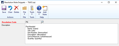 MT-870 | You can now create a specific "parts needed" resolution note snippet in Signature that when selected in MobileTech, the Site Inventory list opens. Technicians can select the part and quantity needed. The resolution note snippet includes additional information related to the selected part. See Set up Resolution Note Snippets for information on setting up the resolution note snippet in Microsoft Dynamics GP and see Enter an Appointment Resolution. In Signature, create the resolution note snippet with a resolution code of PN. Then add the curly bracket information in the description text box along with any other labels that you want to display. One example: Part Needed Another example might be to have everything on one line without descriptions: {name} - {site}: {item number} - {description}, Quantity: {quantity}