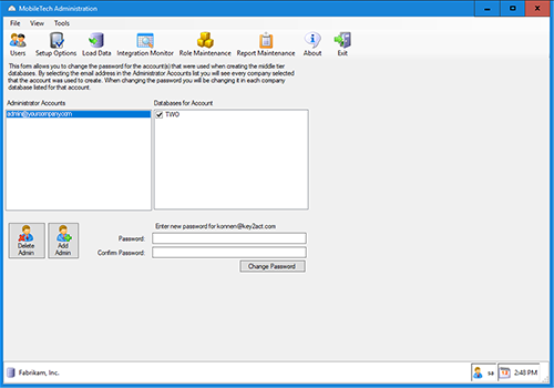 This option is available only for users who belong to the SysAdmin role in SQL Server. These users can be Windows or SQL users. You can change the password for only one MobileTech administrator at a time.
