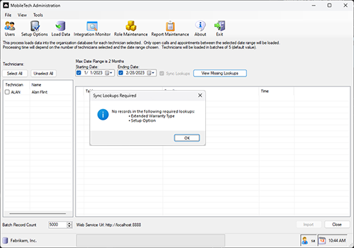 MT-802 | We've updated the Load Data window so that if any of the required lookup tables are missing lookups after the load data process, the Sync Lookups checkbox remains marked and disabled and the View Missing Lookups button is displayed. Select the View Missing Lookups button to display a popup window that lists the required lookups that do not have any records in their table. The required tables include callresolution, appointmentstatus, calltype, costcode, equipmenttype, extendedwarrantytype, manufacturer, paycode, problemtype, taskstatus, unitofmeasure, setupoption. See Load Data for more information. If your company does not use the displayed required lookup(s), like the Extended Warranty Type, you do not have to do anything. This does not indicate that you have missing or bad data.