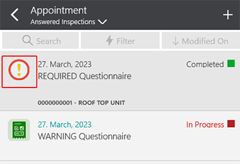 | MT-649 | We've added a warning icon to indicate when an Inspection Report is required. This displays when the Inspection validation is set to REQUIRED. This icon displays on the following lookup views and applies to Service Call, Job, and Equipment required inspections. See Inspection Validation During Appointment Validation Check (optional) for information on setting up the validation levels for inspections.